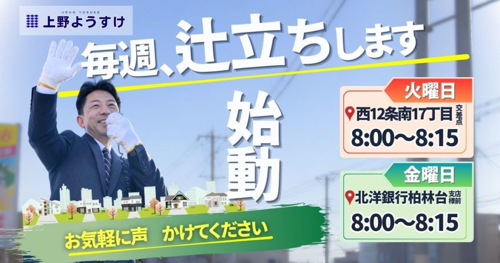 • 毎週火曜日の朝8時から、帯広市西12条南17丁目の交差点で辻立ちを行っています。