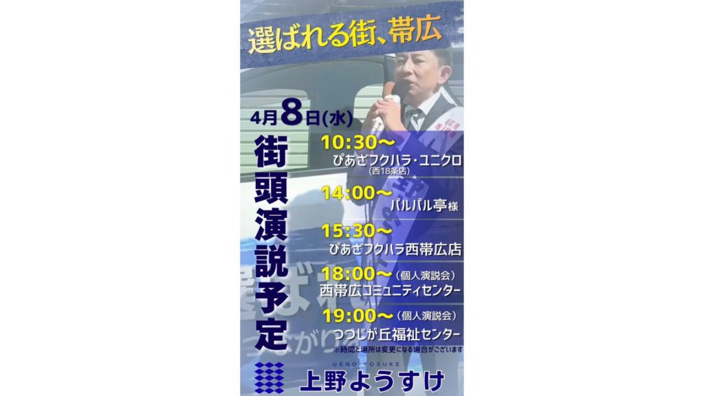 4月8日(水)遊説・演説スケジュール | 上野ようすけ|帯広市長選挙