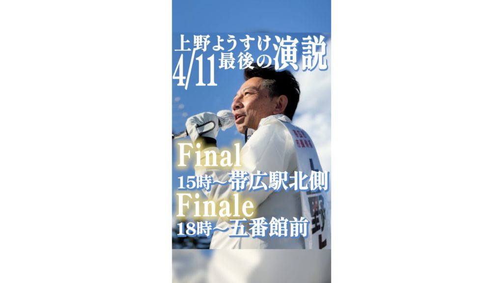 【最終演説 | 大集合】帯広を変える、最後のお願い|4月11日 15:00〜 帯広駅北側 | 4月11日 18:00〜 五番館前